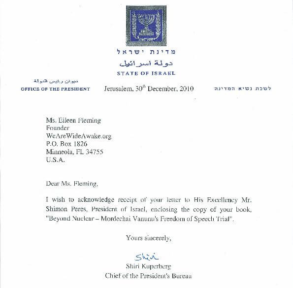 “Everyone has the right to freedom of opinion and expression; this right includes freedom to hold opinions without interference and to seek, receive and impart information and ideas through any media and regardless of frontiers. -Article 19. UN Universal Declaration HUMAN RIGHTS which Israel’s statehood was contingent upon upholding! No shame on e, WeAreWideAwake: THE VANUNU SAGA 2005-2010!”