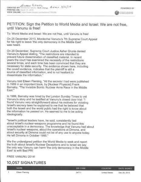 I am asking the committee to remove my name from the nominations…I cannot be part of a list of laureates that includes Simon Peres…Peres established and developed the atomic weapon program in Dimona in Israel…Peres was the man who ordered [my] kidnapping…he continues to oppose my freedom and release…WHAT I WANT IS FREEDOM AND ONLY FREEDOM….FREEDOM AND ONLY FREEDOM I NEED NOW.