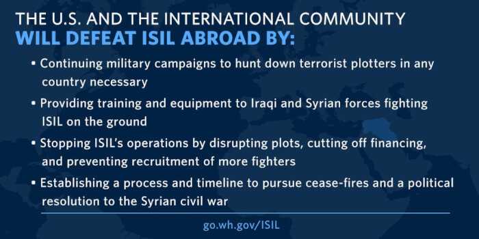 On Sunday President Obama addressed the nation from the Oval Office “in the wake of the terrible tragedy in San Bernardino…[and] what we know. We have no evidence that the killers were directed by a terrorist organization overseas, or that they were part of a broader conspiracy here at home. But it is clear that these killers had embraced a perversion of Islam, stockpiled assault weapons, and committed an act of terrorism….Your security is my greatest responsibility. And I know that, after so much war, many Americans are asking whether we are confronted by a cancer that has no immediate cure. So, tonight, this is what I want you to know: The threat of terrorism is real, but we will overcome it. We will destroy ISIL [Daesh ]any other organization that tries to harm us. Here’ s how…”