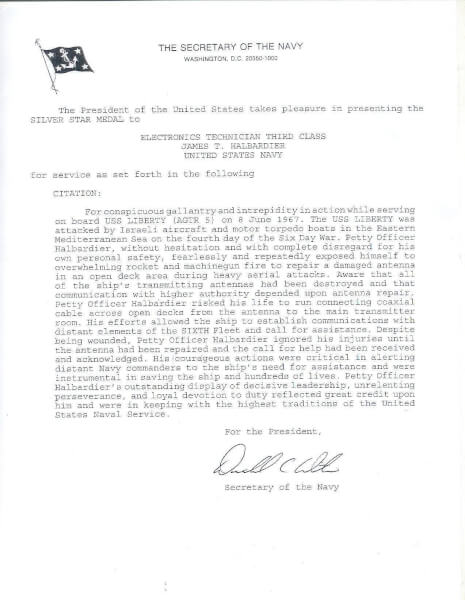 It took until 27 May 2009, for the U.S. Government to award the Silver Star to Halbardier who at the time of Israel’s attack on the USS LIBERTY was a 23-years old who risked his life atop the USS Liberty’s napalm-glazed deck to jury-rig an antenna and get an SOS off to the Sixth Fleet after warplanes and torpedo boats had already killed 34 and wounded 174 of his brothers.