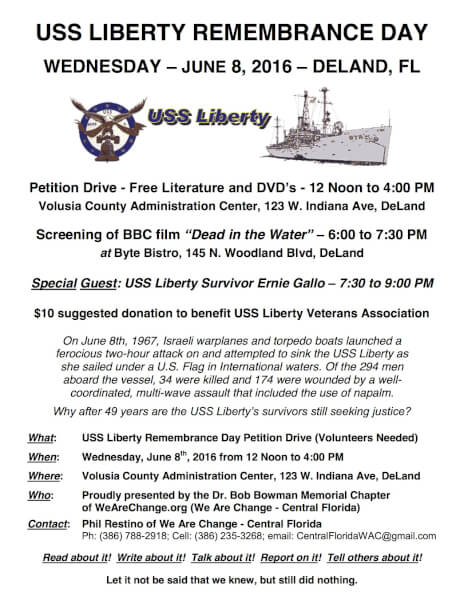 At noon on June 8 at the Volusia County Administration Center the second annual USS Liberty Remembrance Day Petition Drive precedes a screening of the BBC film “Dead in the Water” at 6 PM.