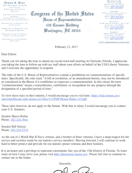 This reporter has contacted her Florida Senators regarding the USS LIBERTY multiple times over the last decade.