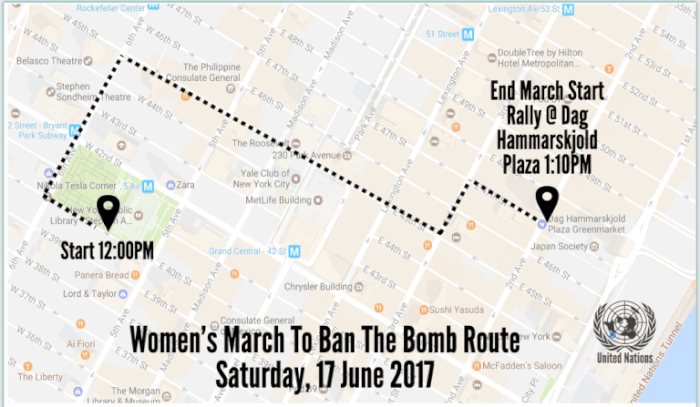 Taking that message to the streets is The Women’s March Ban the Bomb, a women-led initiative building on the momentum of movements at the forefront of the resistance, including the Women’s March on Washington. They are bringing together people of all genders, sexual orientations, ages, races, abilities, nationalities, cultures, faiths, political affiliations and backgrounds to March and Rally for The Nuclear Ban beginning at 12 PM through 4PM on Saturday, June 17th 2017 in the streets of New York City: