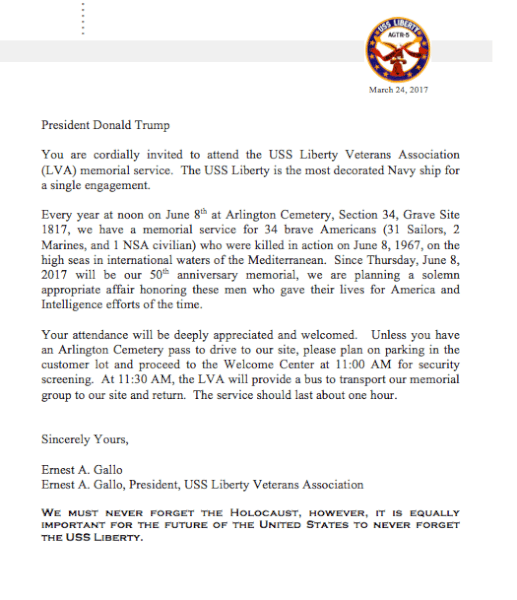 The following is a screenshot of the letter to POTUS Donald J. Trump from Ernest Gallo current President of the USS Liberty Veterans Association: