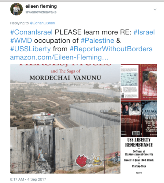 This reporter Without Borders followed Conan at Twitter where he tweeted touristy highlights and referred to Palestinians as Israeli Arabs