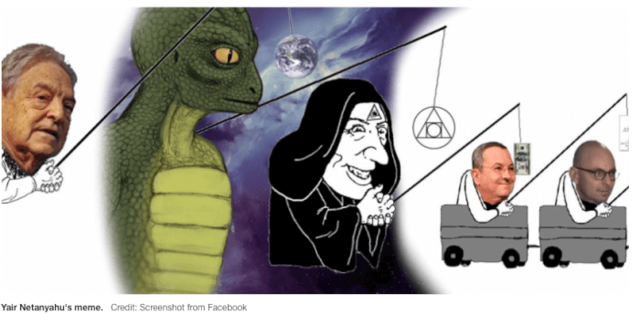 Yair Netanyahu’s facebook meme laden with anti-Semitic imagery captioned “the food chain,” features a photo of George Soros dangling the world in front of a reptilian creature, who dangles an alchemy symbol in front of a caricature reminiscent of the anti-Semitic “happy merchant” image.