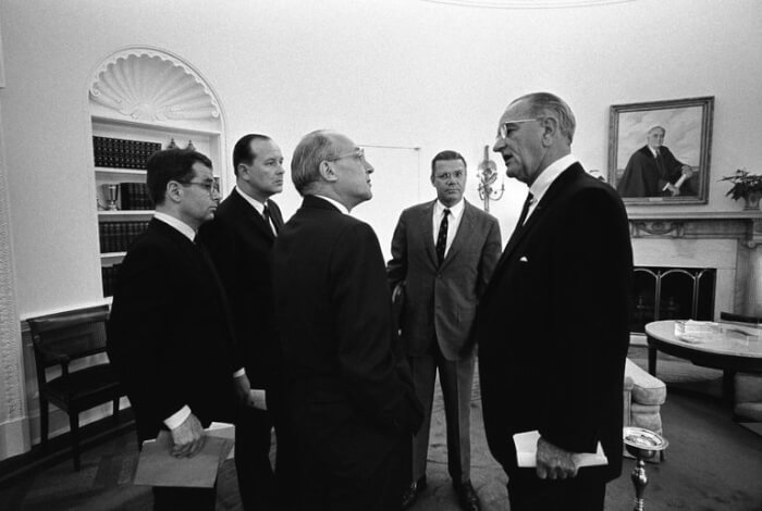 In this photo Walt Rostov is third from the left, speaking to Lyndon Johnson in the Oval Office in 1967.