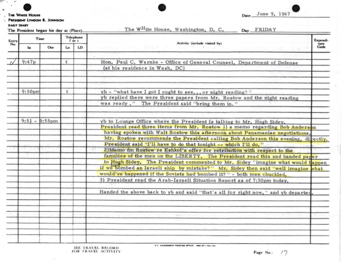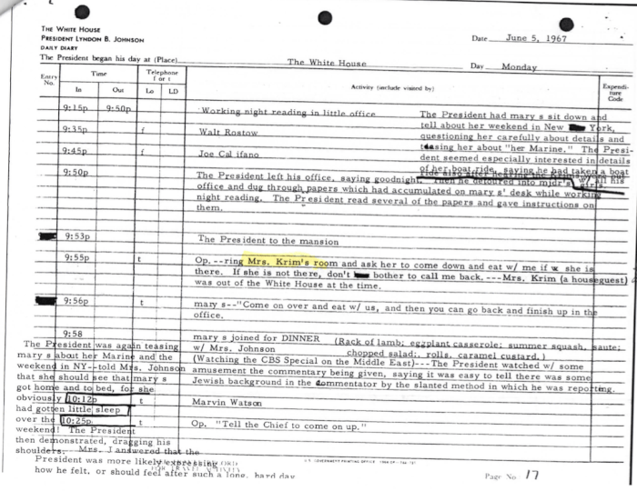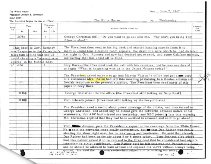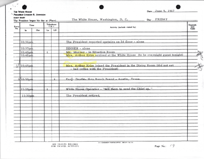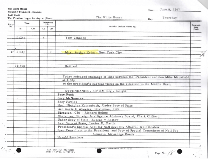Ten days after Dr. Krim died, USS LIBERTY survivor of The Six Day War, Donald Pageler provided the following White House logs documenting Mathildhe Krim’s comings and goings during The Six Day War.