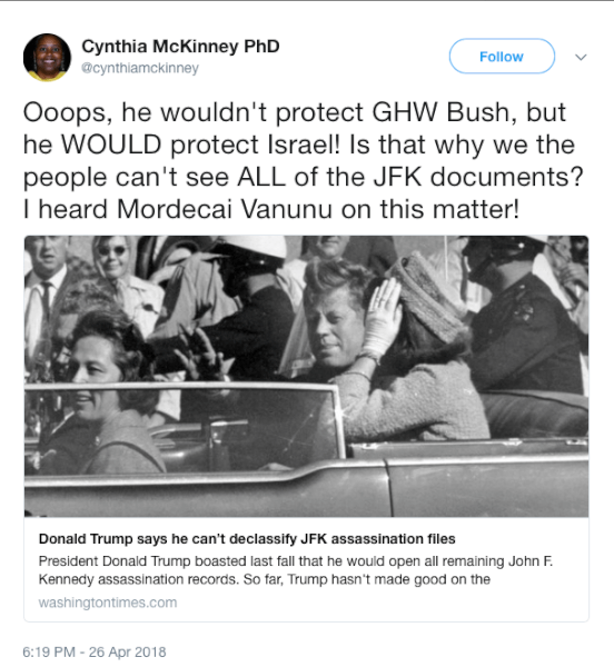 In response Cynthia McKinney tweeted “…why we the people can’t see ALL of the JFK documents? I heard Mordechai Vanunu on this matter!”