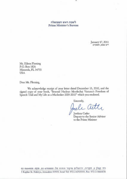 This American reporter began pressing Prime Minister Netanyahu in 2010 about Israel’s nukes and whistle blower Mordechai Vanunu. The following image is of the letter I received from Prime Minister Netanyahu’s office in response to their receiving one of the 400 first and only print copies of THIS BOOK!