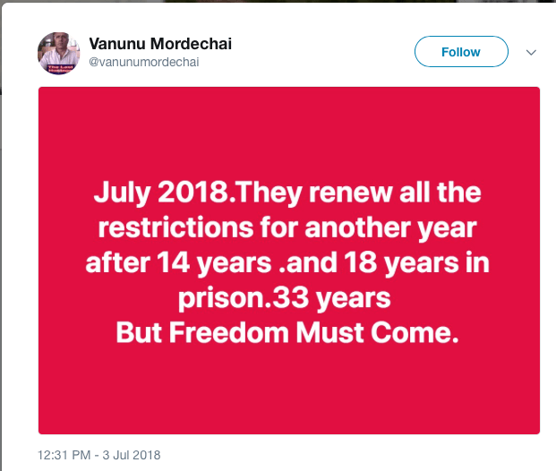 Because corporate media ignores Mordechai Vanunu’s ongoing human rights struggle Israel’s nuclear whistle blower broke the news about Israel’s renewing of the restrictions that include he not speak to foreigners or leave the state at Facebook and Twitter: