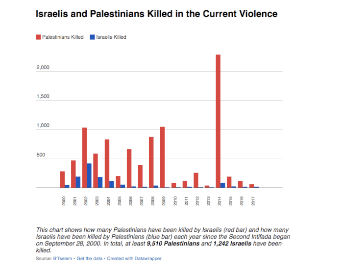 Since 6 December 2017, when Trump announced that the US would recognize Jerusalem as “the capital of Israel,” 27 Palestinians, 2 Israelis have died. However the Associated Press/AP reports on Israeli deaths at a rate nearly four times greater than they report on Palestinian deaths. News reporting Israeli deaths average 471 words in length but reports regarding Palestinian deaths average 171 words.