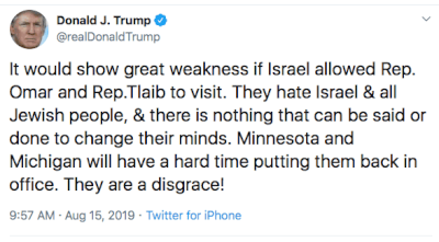 Mr. Trump has spent months attacking Representatives Rashida Tlaib of Michigan and Ilhan Omar of Minnesota, for many reasons including their promoting Boycott Divestment and Sanctions on Israel UNTIL the illegal and immoral occupation of Palestine ends and all the people of the Holy Land have equal human rights.