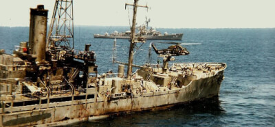 My general quarter’s station was on the mess decks, which was just forward of my sleeping compartment and one level below the main deck. The mess deck was rapidly converted into a hospital for around 170 wounded unarmed men on board the Liberty.